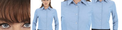 Soft feminine collar. Cross stitched mother-ofpearl effect buttons. 2-button adjustable cuffs, rounded cuffs, additional cufflink buttonholes. Darts at bustline and back panel for a feminine shape. Horizontal last buttonhole.