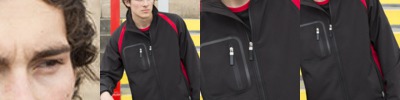 3-layer softshell with funnel neck collar and contrast side panels. Zippered side pockets and zippered front welt chest pocket, with adjustable tabs at cuffs.