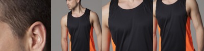 100% polyester with moisture management finish. Contrast side panels with flatlock stitching. Contrast ‘V’ inserts at lower hem. Straight front hem, curved back hem. Twin needle stitched armholes. Gamegear® woven label.