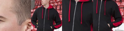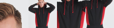 Contrast overarm and side panelling, contrast lined hood, kangaroo pocket