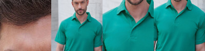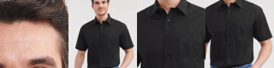 Stand up collar for increased shape retention. Washable at 60°C. Cuffed sleeves. 3 button placket with self-coloured buttons. Short sleeved. Also available in women's