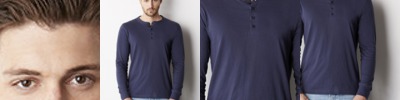 Taped neckline. 3 button fused placket, selfcoloured buttons. Reinforced shoulder seams with single needle stitching. Ribbed flat-knit collar and cuffs.