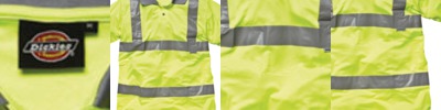 Two 5cm high visibility strips around the body, and one over each shoulder. Ribbed cuff on sleeve. Rib polo collar with three button placket. Conforms to BS EN471: 2003 Class 2.