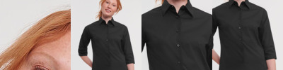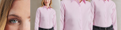 Stretch fabric for added comfort and fit. Requires minimal care, darts on back panel and on front from bottom hem to bust, for fitted ladies' shape. 7 button placket with matching colour buttons. Classic single button collar, elbow-length sleeve with split cuff.